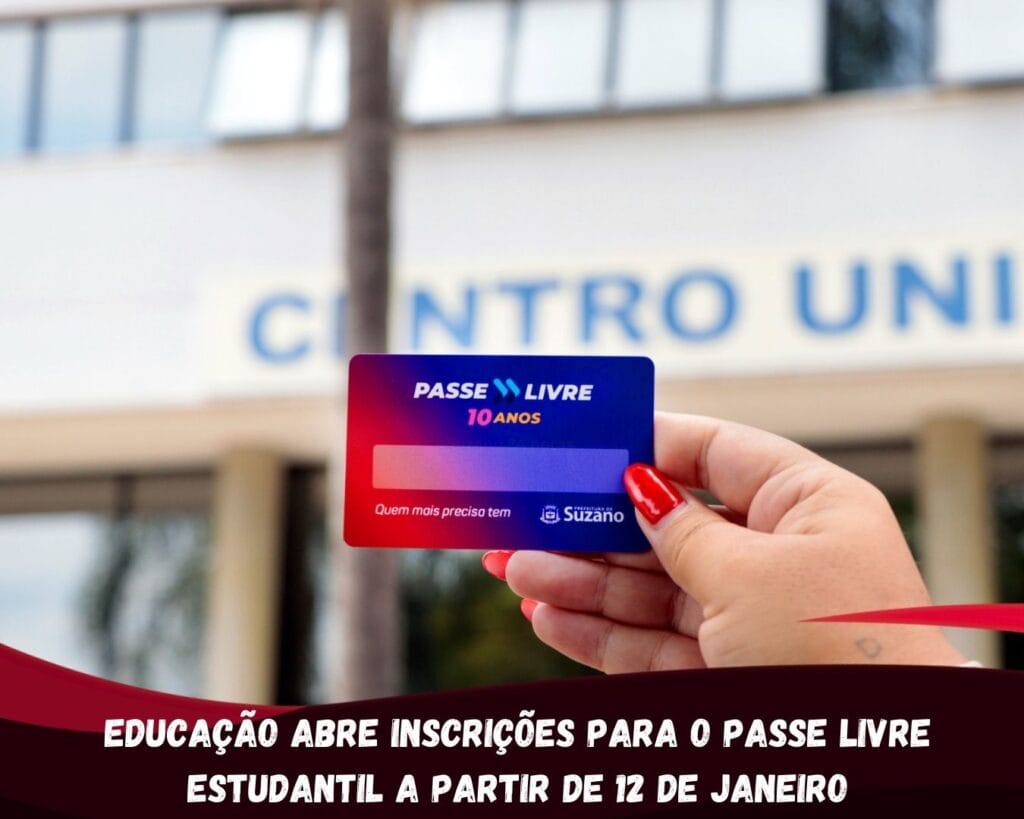 A Secretaria Municipal de Educação de Suzano abre, a partir do dia 12 de janeiro (segunda-feira), as inscrições para o Passe Livre Estudantil referente ao 1º semestre de 2026. O prazo para cadastro e recadastramento se estenderá até 30 de abril, com expectativa de alcançar aproximadamente 3 mil beneficiados no retorno às aulas da rede pública e privada.