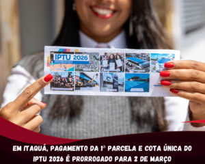 A Itaquaquecetuba prorrogou até 2 de março o prazo para pagamento da cota única do IPTU 2026, com 10% de desconto, e também da primeira parcela do imposto. A medida foi adotada em razão da greve dos Correios, que ocasionou atraso na entrega dos carnês aos moradores. O vencimento anterior estava previsto para 15 de fevereiro.